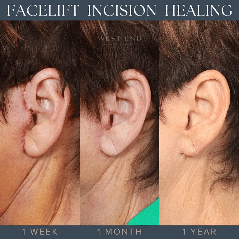 This is a close-up of a patient who had a Facelift with Dr. Wang. Below are the stages of incision healing after a Facelift: